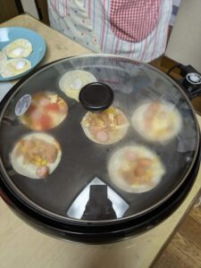 具材を切ってのせ、餃子の皮を焼き、パリパリ食感の美味しいピザが出来上がりました。