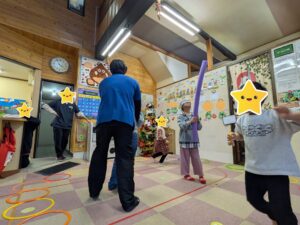 放課後等デイサービスのお友達と一緒に「気配切り」「的当て」を行いました。