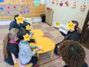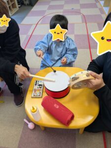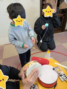 大好きな読み聞かせを見て楽しんだり、音楽療法では太鼓やトライアングルを使い、曲に合わせてパーカッションを行いまいした。