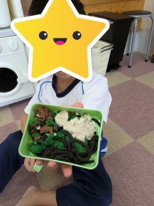 感覚遊びでは粘土製作を行いました。粘土で美味しいお弁当ができました。