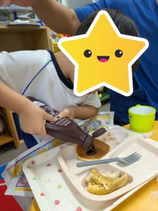 おやつは大好きなパンケーキです。お好みででチョコレートソースをかけました。