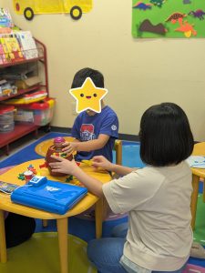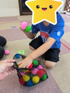 カラーボールでは色の確認とボール投げを行いました。終わった後はきちんとお片付けができました。