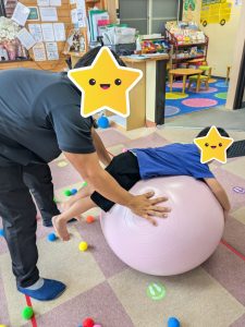 運動機能訓練ではバランスボールを使い、体幹トレーニングを行いました。