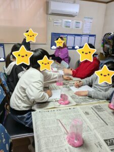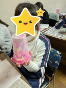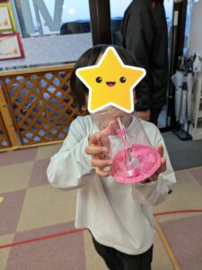 プラスチックコップや花紙を使い「さくらドーム」を作りました。ストローで吹くと花びらが舞い、とてもきれいでした。