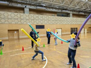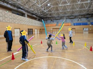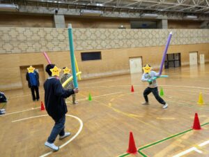 内原ヘルスパークで「チャンバラ合戦」を行いました。相手の紙コップを落とすのに必死な子ども達・・・。盛り上がりは最高でした。